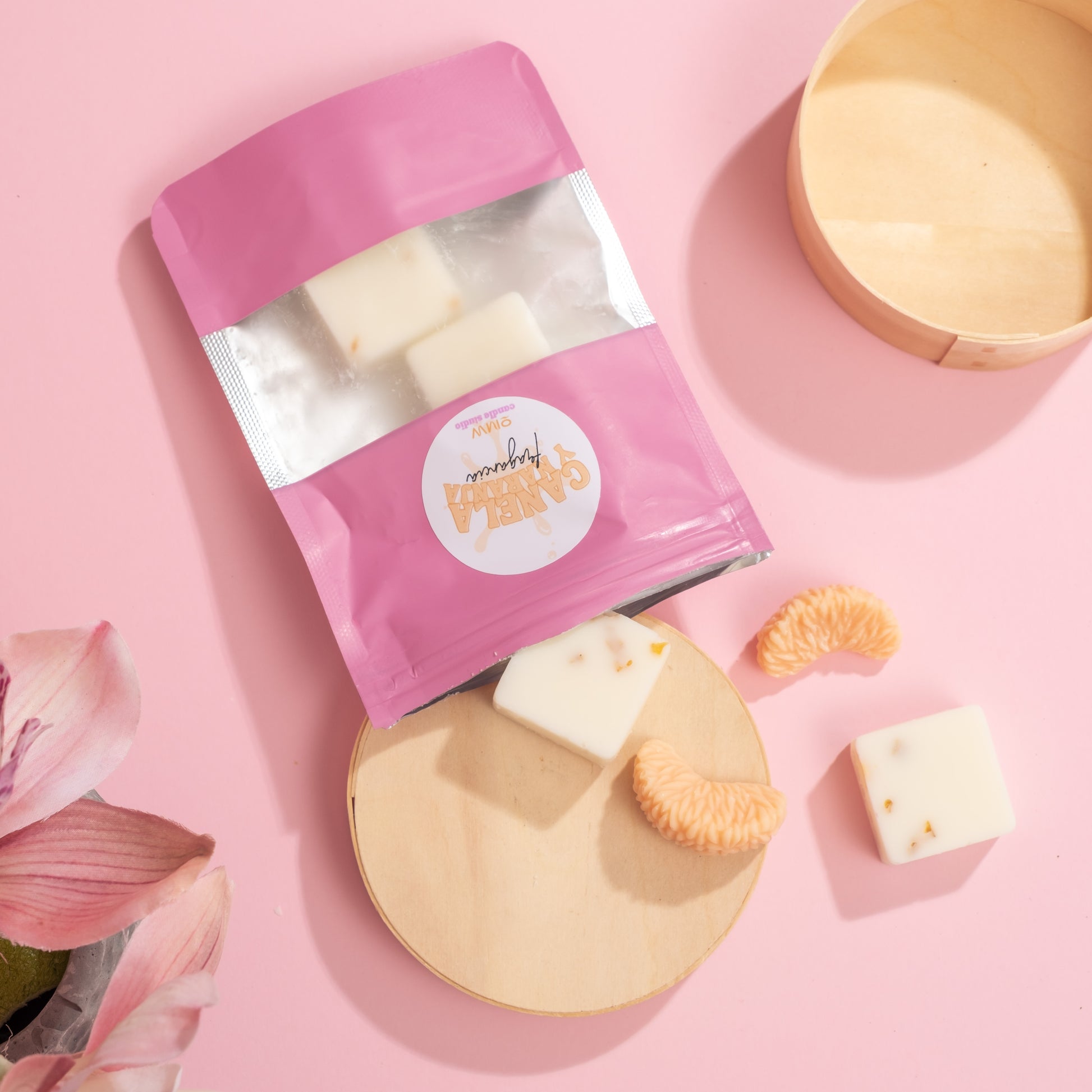 Bolsa con 60 gr de wax melts en forma de cuadraditos y gajos de naranja con un intenso aroma a canela y naranja y con una duración de más de 100 horas según su utilización. Los wax melts están fabricados con mica natural, por lo que desprenderán un brillo muy especial al derretirse, y además, los cuadraditos contienen corteza de naranja deshidratada, aportando más aroma natural.