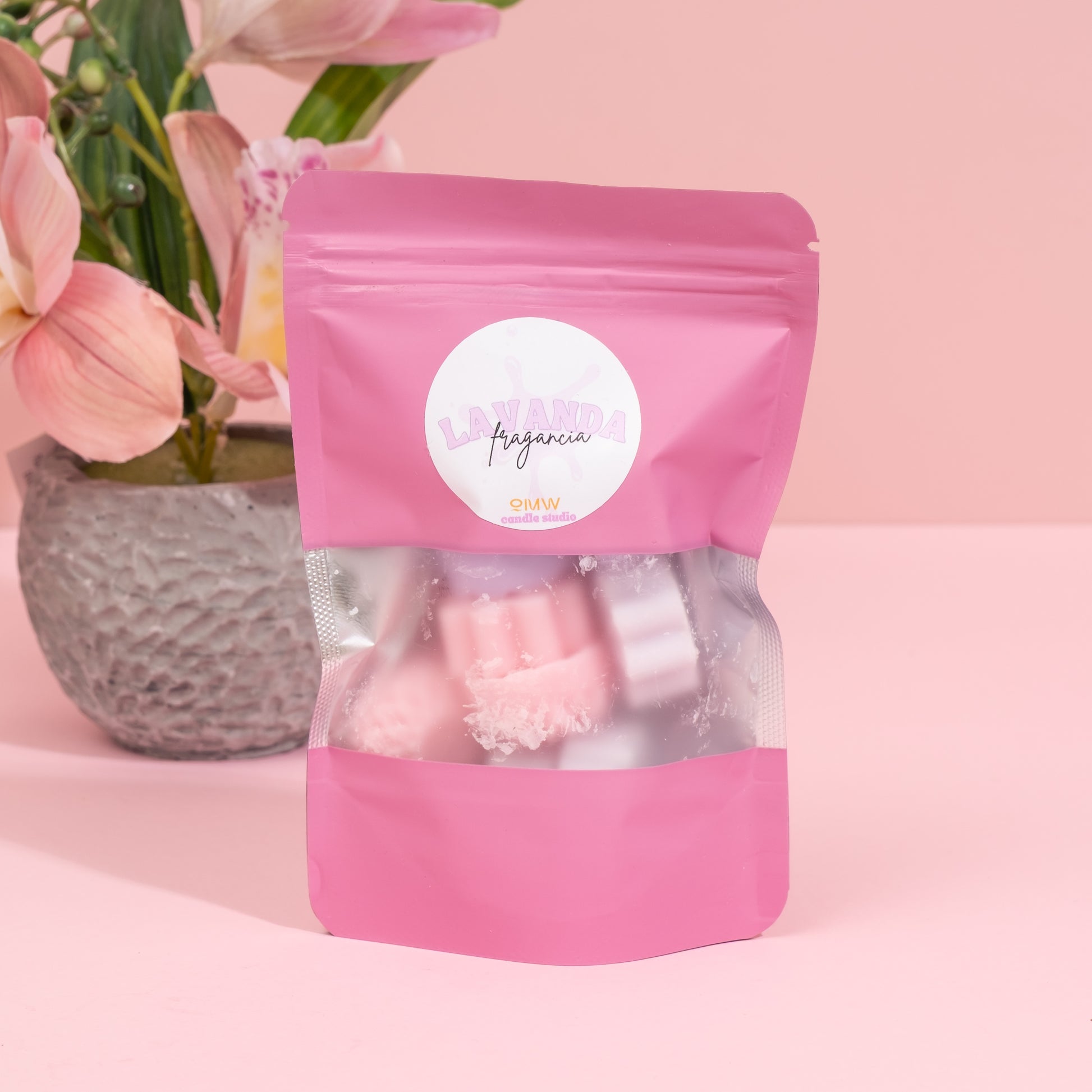 Bolsa con 60 gramos de wax melts en forma de flores variadas, en tonos rosas y lilas, con un potente aroma a lavanda🪻 y con una duración de más de 100 horas según su utilización. Los wax melts están decorados con mica natural, por lo que desprenderán un brillo muy especial al derretirse.